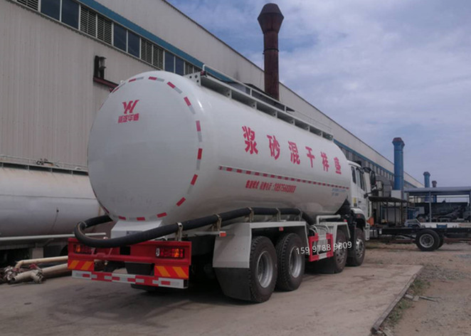 湖南客戶訂購重汽前四后八25方砂漿車已完工,準備發車,重汽前四后八25方砂漿車配置:重汽8*4底盤,340馬力國五發動機,重汽10檔變速箱,153前橋,457后橋,11.00R20鋼絲胎,原廠空調,電動車窗,罐體輕剛制作,干混砂漿結構,有效容積25立方,兩倉,三進料口,卸料管路選用Q345耐磨無縫管,DN50砂漿專用安全閥,標配8米砂漿專用卸料管。