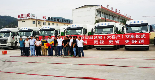 次日,西安分公司攜西安瑞通又在延安向大用戶交付10臺豪瀚J7B牽引車,該用戶之前已經擁有重汽的T7H、T5G產品,現在又購買10臺豪瀚,是重汽的絕對忠誠用戶。