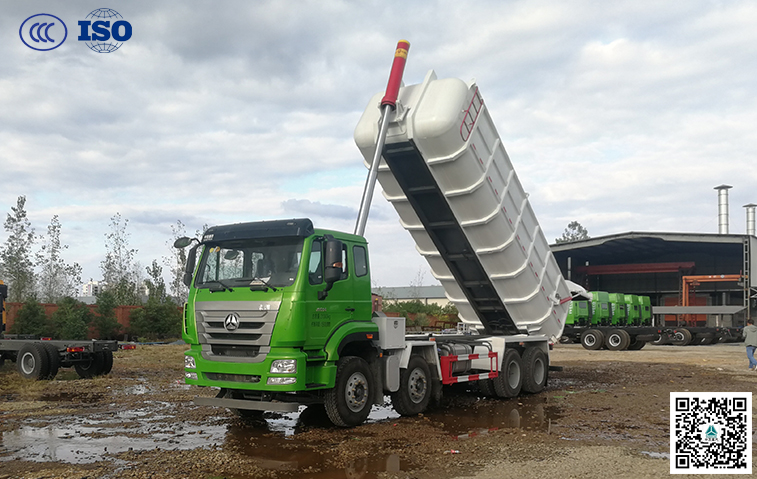 3、裝載量大,弧形廂體,尺寸:7450×2250×1500mm,罐體有效容積可做到25m3,廂體舉升角度可根據運輸物料調整,大可達到47°;