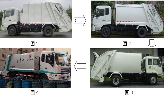 如下圖1-圖2-圖3-圖4所示為不同時期壓縮式垃圾車的造型發展過程,造型美觀化是以后環衛產品設計的方向。