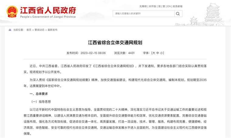 2月15日,江西省委、江西省人民政府印發了《江西省綜合立體交通網規劃》,全面提升綜合交通整體能力和效率,優化交通資源要素配置,完善綜合交通基礎設施布局,強化各方式有效銜接,促進綜合交通一體化、高質量發展。到2035年,江西綜合立體交通網實體線網總規模將達到24萬公里以上,其中鐵路總里程達8000公里以上,公路總里程23萬公里左右,航道總里程5740公里左右。公路方面,形成“十縱十橫十繞”多中心放射狀高速公路網布局,總里程達到1萬公里以上,基本實現“市市有繞城、縣縣雙高速”,鄉鎮30分鐘上高速公路;普通國省干線公路基本覆蓋省級及以上開發區、鄉鎮和4A級及以上旅游景區;農村公路網基本實現縣道三級及以上公路、建制村通雙車道公路全覆蓋,總里程達20萬公里以上。