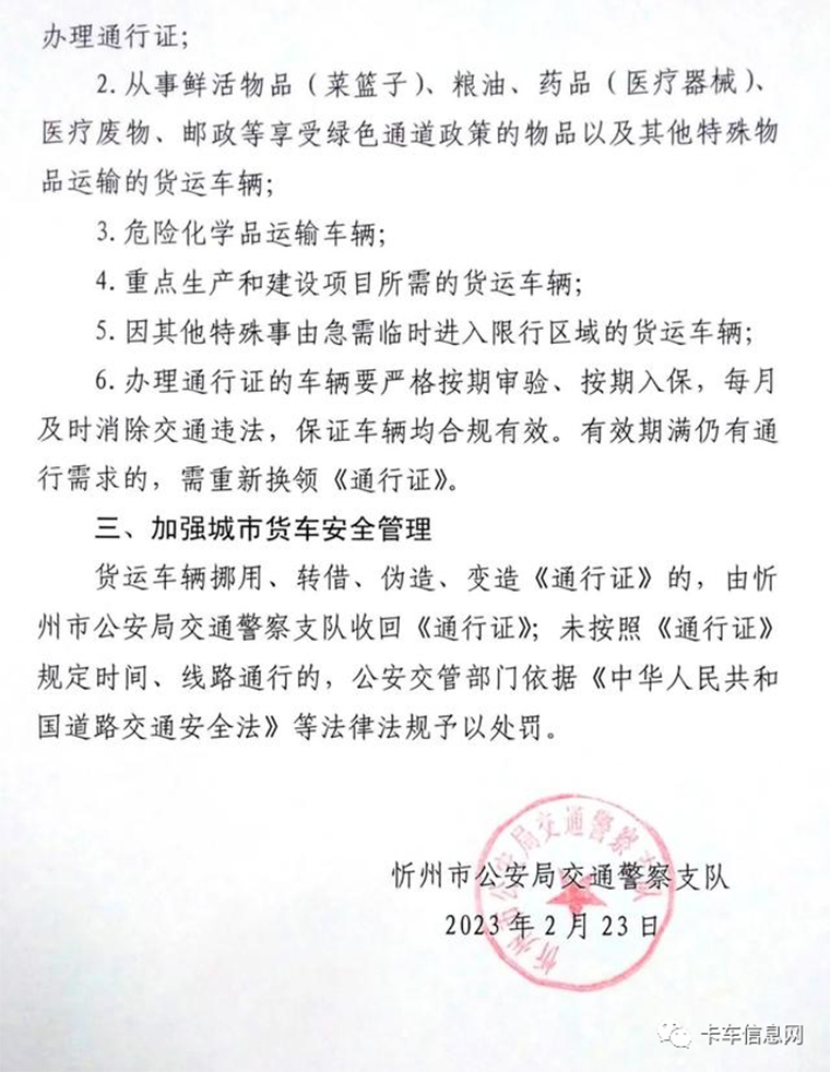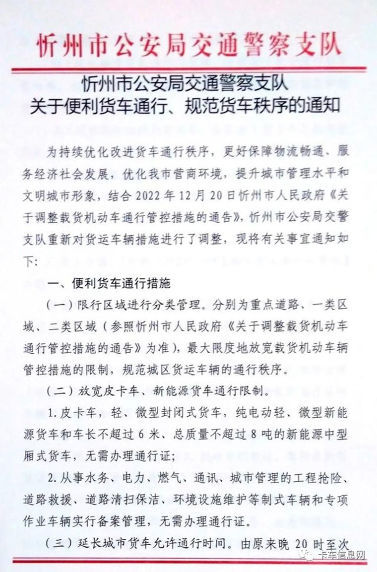 為持續優化改進貨車通行秩序,更好保障物流暢通、服務經濟社會發展,優化忻州市營商環境,提升城市管理水平和文明城市形象,結合2022年12月20日忻州市人民政府《關于調整載貨機動車通行管控措施的通告》,忻州市公安局交警支隊重新對貨運車輛措施進行了調整。