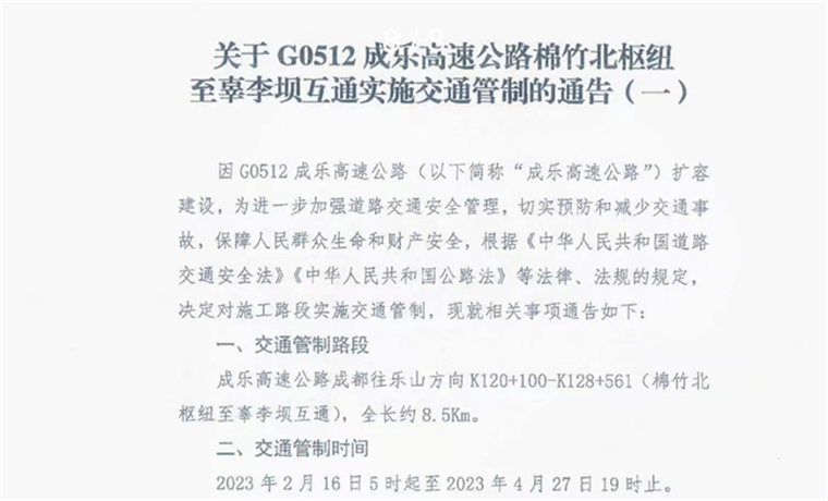 2月14日,四川省交通運輸廳發布消息,自2023年2月16日5時起至2023年4月27日19時止,因G0512成樂高速公路擴容建設,成樂高速公路成都往樂山方向K120+100-K128+561(棉竹北樞紐至辜李壩互通),全長8.5km范圍內實行交通管制,管制路段內成都至樂山方向主線道路斷道封閉,成都至樂山方向車輛從樂山站分流出戰;成樂高速公路樂山北收費站往宜賓方向A匝道封閉;樂山繞城高速棉竹北樞紐往樂山方向匝道封閉。