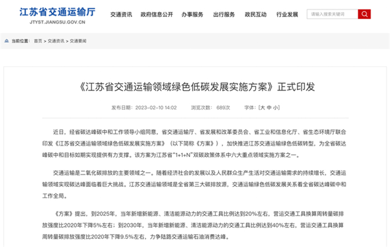 2月10日,江蘇省交通運輸廳、江蘇省發展和改革委員會、江蘇省工業和信息化廳、江蘇省生態環境廳聯合印發《江蘇省交通運輸領域綠色低碳發展實施方案》。《方案》提出,到2025年,當年新增新能源、清潔能源動力的交通工具比例達到20%左右,營運交通工具換算周轉量碳排放強度比2020年下降5%左右;到2030年,當年新增新能源、清潔能源動力的交通工具比例達到40%左右,營運交通工具換算周轉量碳排放強度比2020年下降9.5%左右,力爭陸路交通運輸石油消費達峰。