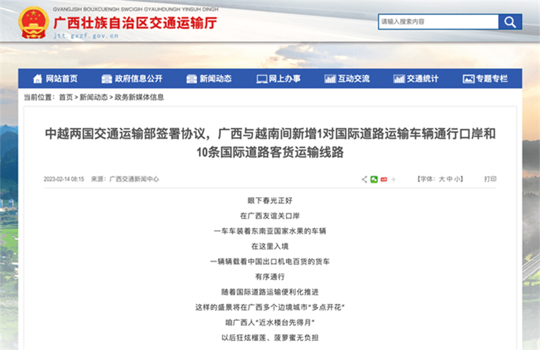 2月14日,廣西壯族自治區交通運輸廳發布消息稱,中越兩國交通運輸部簽署的《關于新增中越國際道路客貨運輸線路和國際道路運輸車輛通行口岸的協議》已生效實施,廣西與越南間新增1對國際道路運輸車輛通行口岸和10條國際道路客貨運輸線路。