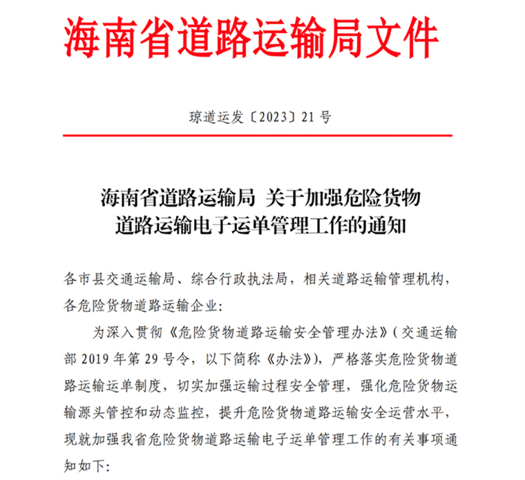 2月3日,海南省道路運輸局印發《關于加強危險貨物道路運輸電子運單管理工作的通知》,明確全省危險貨物道路運輸電子運單實行一車一趟一派,車輛在發車前應在電子運單系統中完成電子運單填報,未填報、上傳電子運單的車輛不得執行運輸任務!锻ㄖ芬螅魇锌h交通運輸局、道路運輸管理機構要督促運輸企業加強對相關人員的系統操作培訓,確保相關人員切實做到規范填寫、使用電子運單;全面清查運輸企業從業人員持證上崗情況,把好新聘用從業人員準入關,嚴肅查處無資質從業人員并追究其所在企業責任。