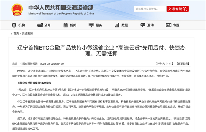 2月2日,遼寧省高速公路ETC金融支持服務產品——“高速云貸”正式上線。這是遼寧交投集團與中國建設銀行遼寧省分行合作,在全國率先推出的為小微運輸企業推出的高速公路通行信用貸款服務,助力貨運物流高效運轉。單戶貸款額度6萬至200萬元,無需抵押,最低年利率3.95%,授信期1年。