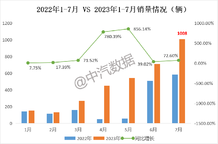 2023年1-7月,除2月銷量略有下降,總體銷量呈快速增長態勢,且相較2022年同期,各月份均實現不同程度的增長。