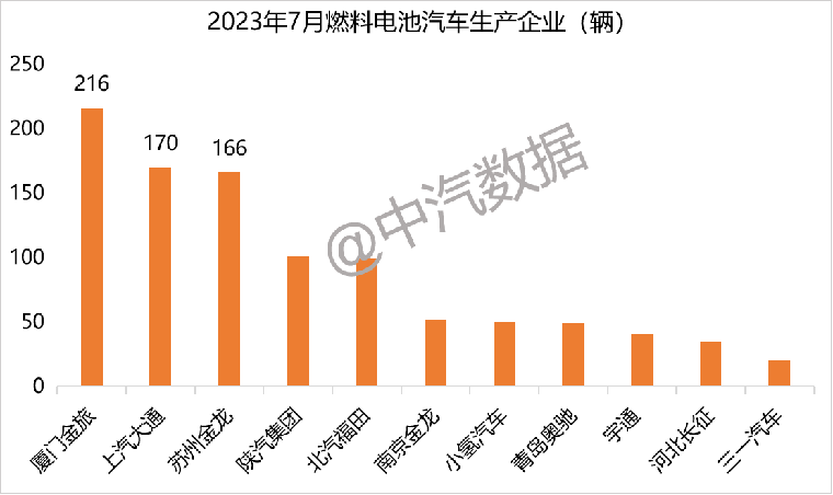 從燃料電池整車企業競爭格局來看,2023年7月,燃料電池汽車生產企業市場集中度較高,銷量前三位的廈門金旅、上汽大通和蘇州金龍銷量分別為216輛、170輛和166輛,占7月總銷量的54.8%。但燃料電池汽車企業競爭格局仍處于動態變化中。